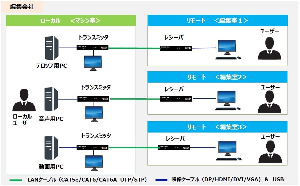 PCをサーバー室に移動し、KVMエクステンダ KVX によりPCを離れた編集室で操作。